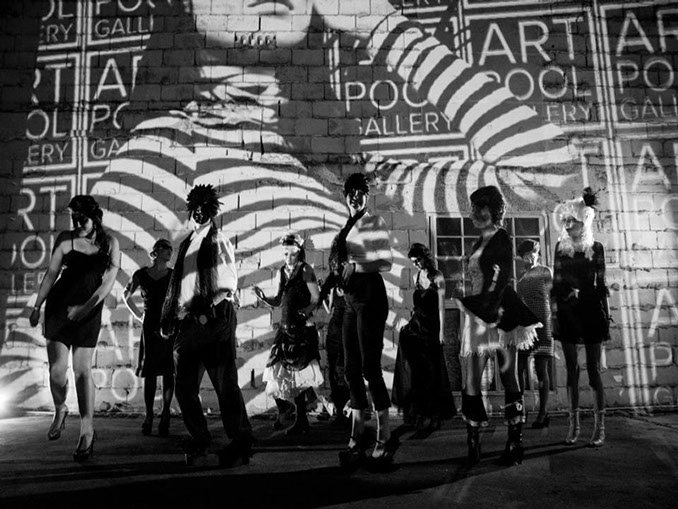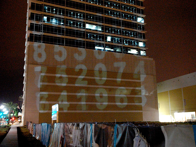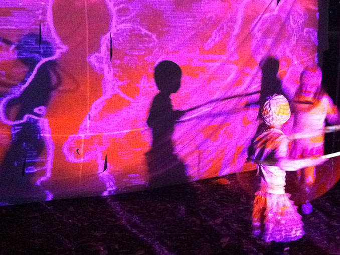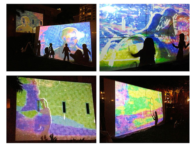 Video Projections on Scrim and Building Exterior featuring hula hooping youngsters